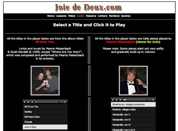 solution: the project had many aspects. the client decided to add a section for his business teaching cello lessons. that required a new section to be added to the site that includes a flash audio player and quicktime video full length movies.
